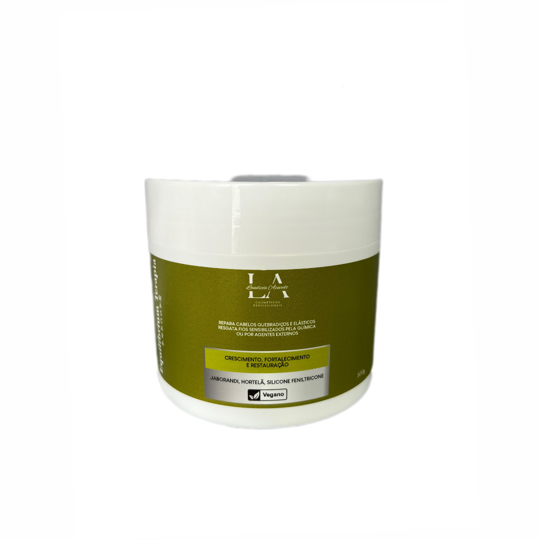 Máscara: crescimento, fortalecimento e restauração. Principais ativos: jaborandi, hortelã,silicone, feniltricone.